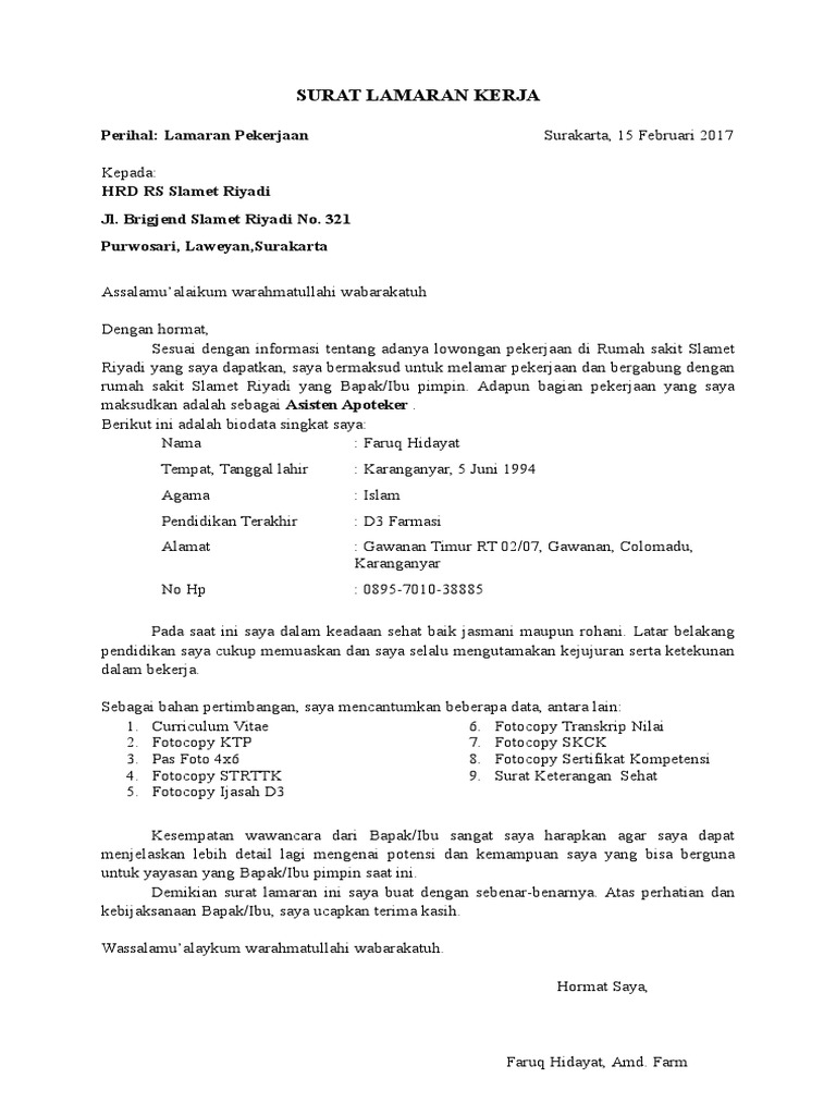 Contoh Surat Lamaran Kerja Di Rumah Sakit Sebagai Asisten Apoteker Kumpulan Contoh Gambar from cdn.slidesharecdn.com Apoteker contoh surat lamaran kerja rumah sakit. We did not find results for: Maybe you would like to learn more about one of these? Check spelling or type a new query.